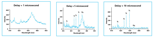 在測(cè)量時(shí)要使用帶門(mén)控的探測(cè)器來(lái)記錄激光脈沖延遲一段時(shí)間后所產(chǎn)生的激光等離子體的光輻射,這是由于只有在等離子體已經(jīng)膨脹并開(kāi)始冷卻時(shí)才會(huì)出現(xiàn)原子或者離子的特征輻射譜線。下面的光譜圖中展示了在不同的探測(cè)器采樣時(shí)間延遲下得到的锝的特征輻射譜線。