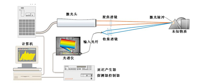 在如此之高的激光功率密度作用下,被測(cè)材料表面就會(huì)有幾微克的物質(zhì)被噴射出來(lái),這個(gè)過(guò)程通常被稱(chēng)為激光剝離,同時(shí)材料表面還會(huì)產(chǎn)生壽命很短但亮度很高的等離子體,其瞬間溫度可達(dá)10,000℃。在這個(gè)熱等離子體中,噴射出來(lái)的物質(zhì)離解成激發(fā)態(tài)的原子和離子。在激光脈沖結(jié)束后,由于等離子體以超音速向外擴(kuò)展所以迅速地冷卻下來(lái)。在這段時(shí)間內(nèi),處于激發(fā)態(tài)的原子和離子從高能態(tài)躍遷到低能態(tài),并發(fā)射出具有特定波長(zhǎng)的光輻射。用高靈敏度的光譜儀對(duì)這些光輻射進(jìn)行探測(cè)和光譜分析分析,就可以得到被測(cè)材料的元素構(gòu)成信息。