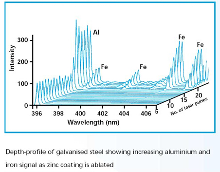 由于激光可以以一種可控的方式來(lái)清除表面涂層,因此分層結(jié)構(gòu)的深度輪廓分析可以用LIBS技術(shù)來(lái)進(jìn)行。 在激光不斷“鉆入”到被測(cè)材料中的同時(shí)用光譜儀對(duì)其產(chǎn)生的光輻射進(jìn)行光譜測(cè)量,就可以得到被測(cè)材料的構(gòu)成成分元素隨深度變化的函數(shù)。通常這一技術(shù)只能用于那些在典型LIBS系統(tǒng)中激光器的參數(shù)下比較容易去除的材料。比如在鋼材上鋅鍍的過(guò)程控制中的成分分析,探測(cè)油漆中的重金屬(鉛、鈾、钚等),檢測(cè)混凝土的成分污染等。