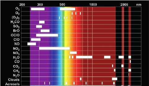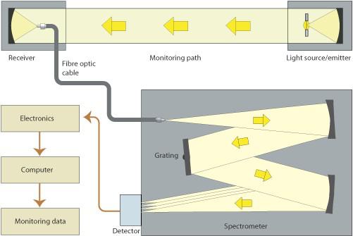 DOAS以比爾-朗伯定律為依據(jù),該定律描述了光路中分子數(shù)與被吸收的光能之間的關系。由于每種分子,每種氣體,都有其吸收光譜特性,或者稱為“指紋”,所以可以通過紫外-可見波長范圍內的特征吸收結構同時測量出幾種不同氣體的濃度。典型的DOAS儀器由連續(xù)光源(氙燈、氘燈等),氣室(或開放光路),探測器組成。根據(jù)比爾-朗伯定律: