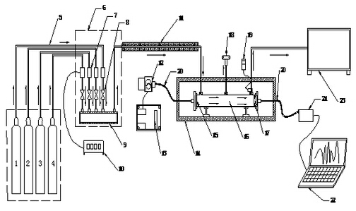 1 高純氮;2 SO2標氣;3 NO標氣;4 NO2標氣;5 輸氣管;6 配氣柜;7 質量流量控制器;8 截止閥;9 混合管;10 流量顯示儀;11 拌熱管;12 光源模塊;13 光源供電電源;14 高溫試驗箱;15 準直透鏡;16 測量池;17 聚焦透鏡;18 差壓計;19 溫度控制儀;20 光纖;21 光譜儀;22 電腦;23 廢氣回收池