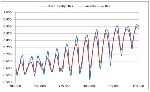 光譜分辨率也稱光譜帶寬,通常用nm或cm-1表示。分辨率越高,分辨光譜細節(jié)的能力越強,下圖是光譜儀不同分辨率下的測試結果,從圖4可以看出,分辨率提高后原本不明顯的特征逐漸明顯,例如290nm附近的光譜凹陷。